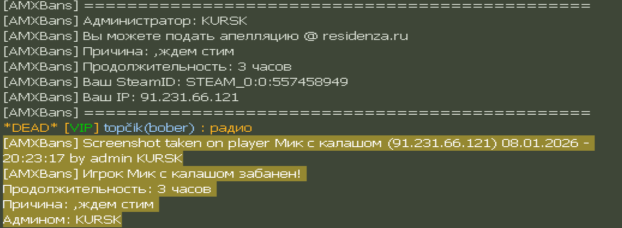 [AMXBans] Screenshot taken on player Мик с калашом (91.231.66.121) 08.01.2026 - 20:23:17 by admin KURSK